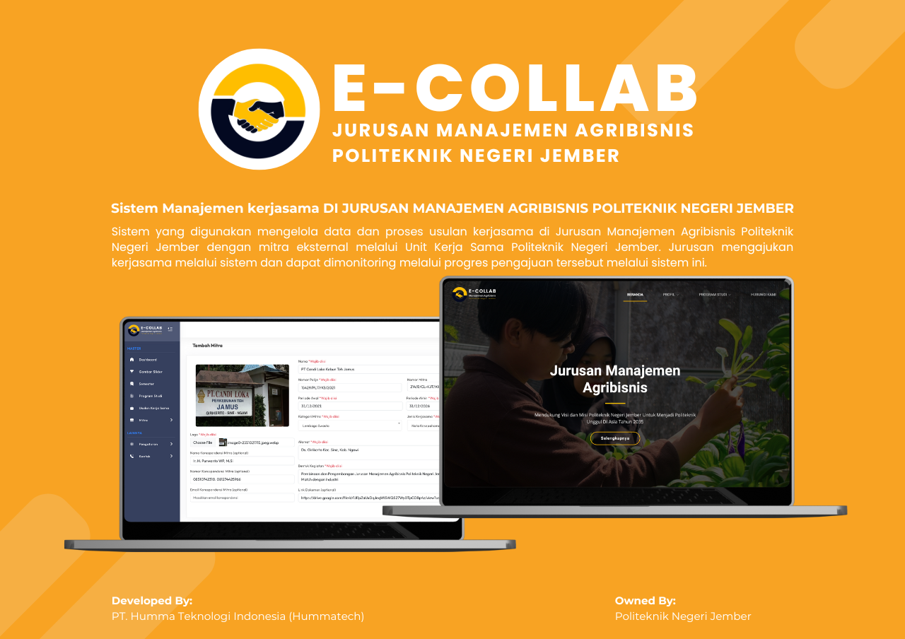 Sistem yang digunakan mengelola data dan proses usulan kerjasama di Jurusan Manajemen Agribisnis Politeknik Negeri Jember dengan mitra eksternal melalui Unit Kerja Sama Politeknik Negeri Jember. Jurusan mengajukan kerjasama melalui sistem dan dapat dimonitoring melalui progres pengajuan tersebut melalui sistem ini.